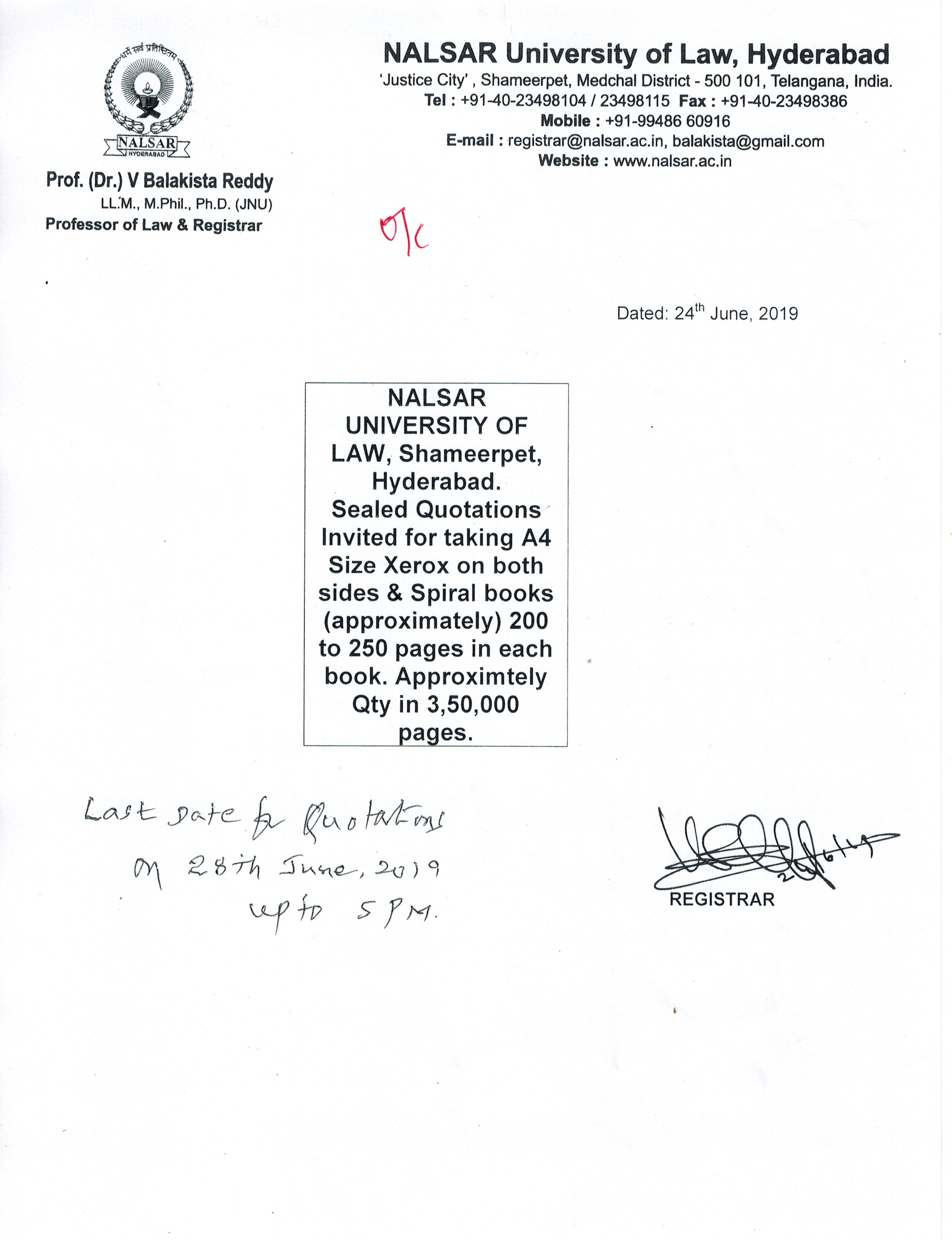 Lifting of all scrap items at NALSAR University of Law, Shamirpet. Last Date of submission of quotations: 24/03/2026 upto 3.00