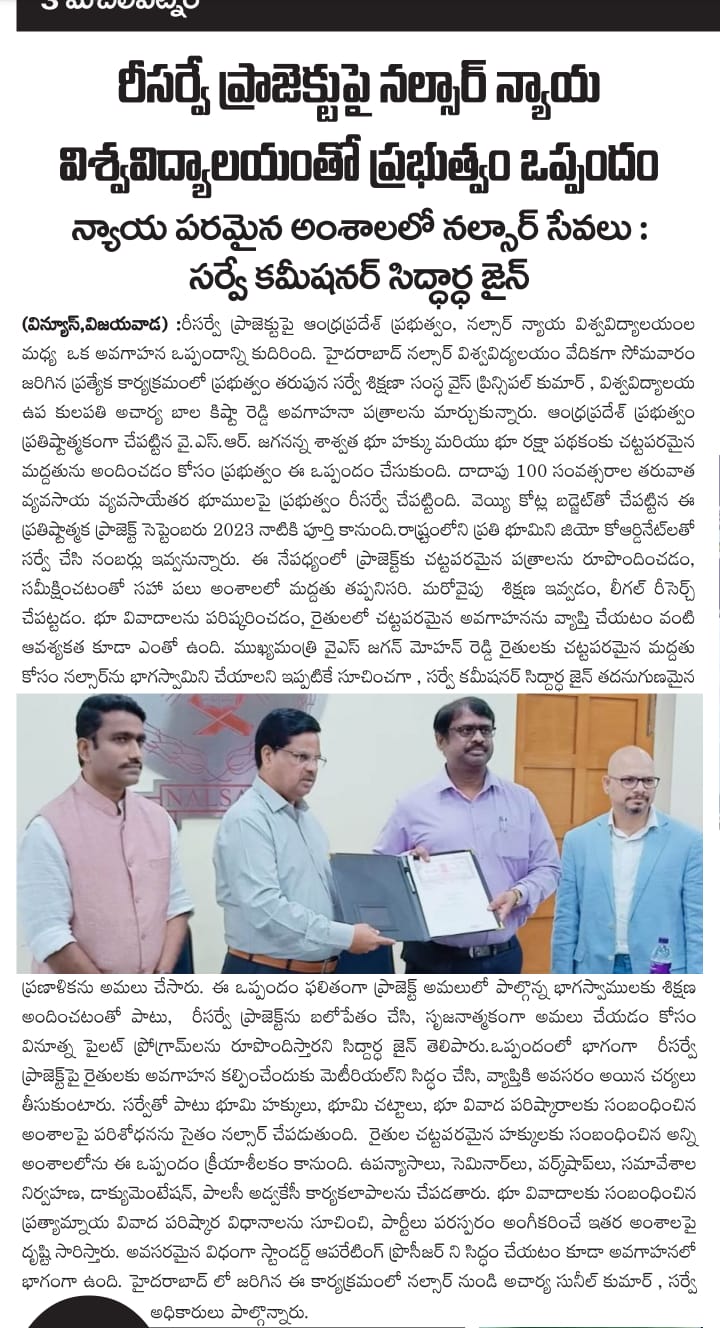 The Government of Andhra Pradesh today signed a MoU with NALSAR's Centre for Tribal and Land Rights (CTLR) for providing legal support for the prestigious resurvey project of Government of Andhra Pradesh (YSR Jagananna Saswatha Bhoo Hakku Mariyu Bhoo Raksha Padhakam)