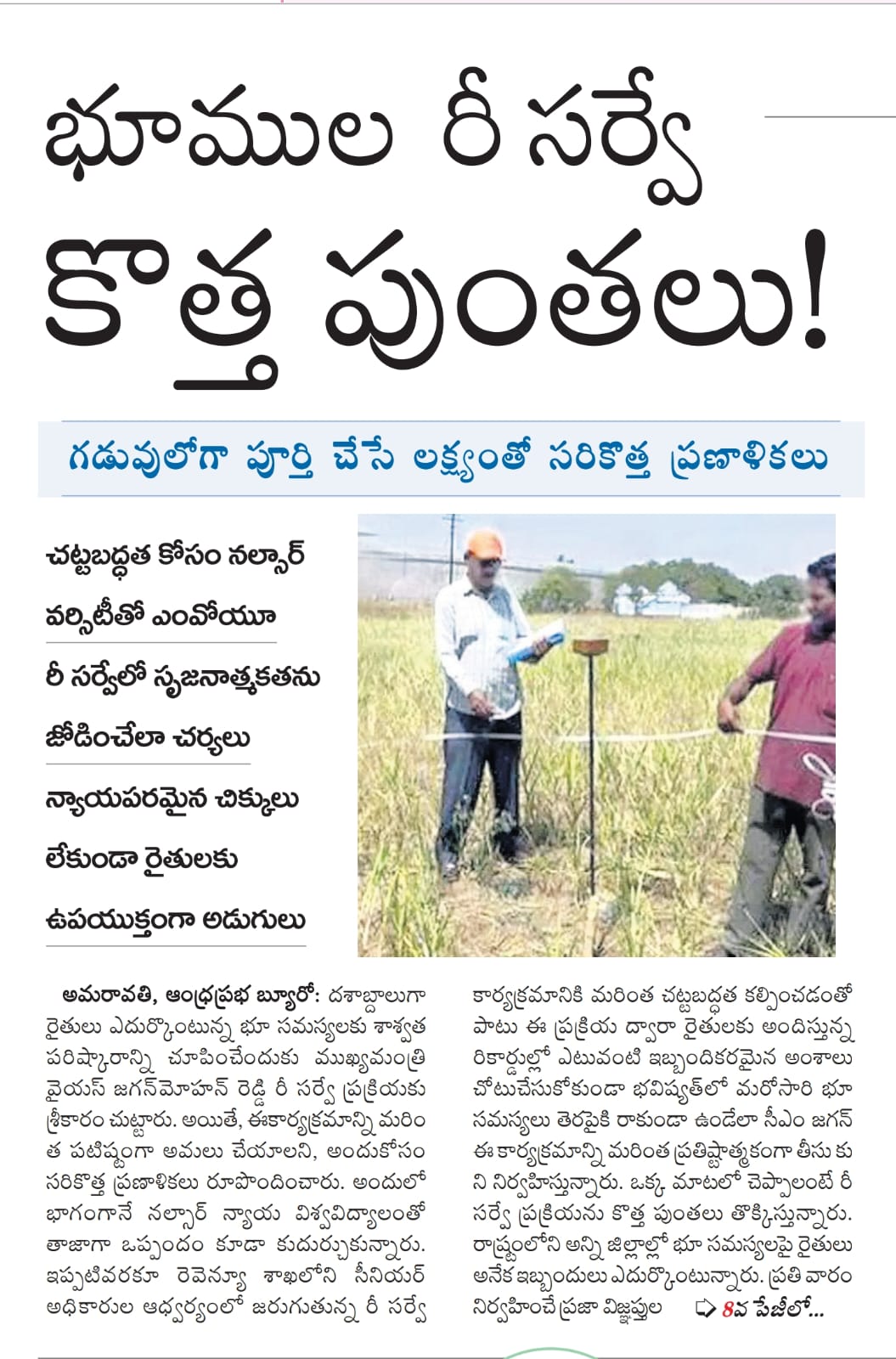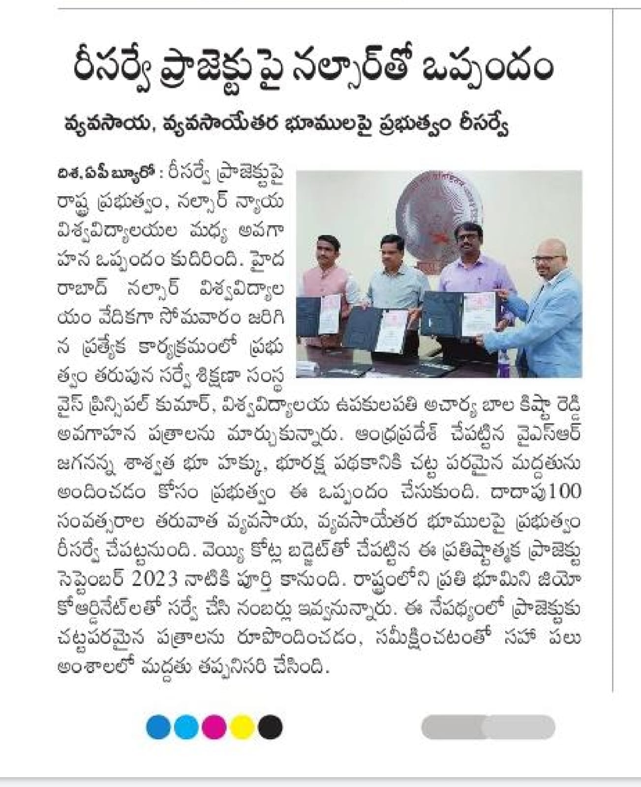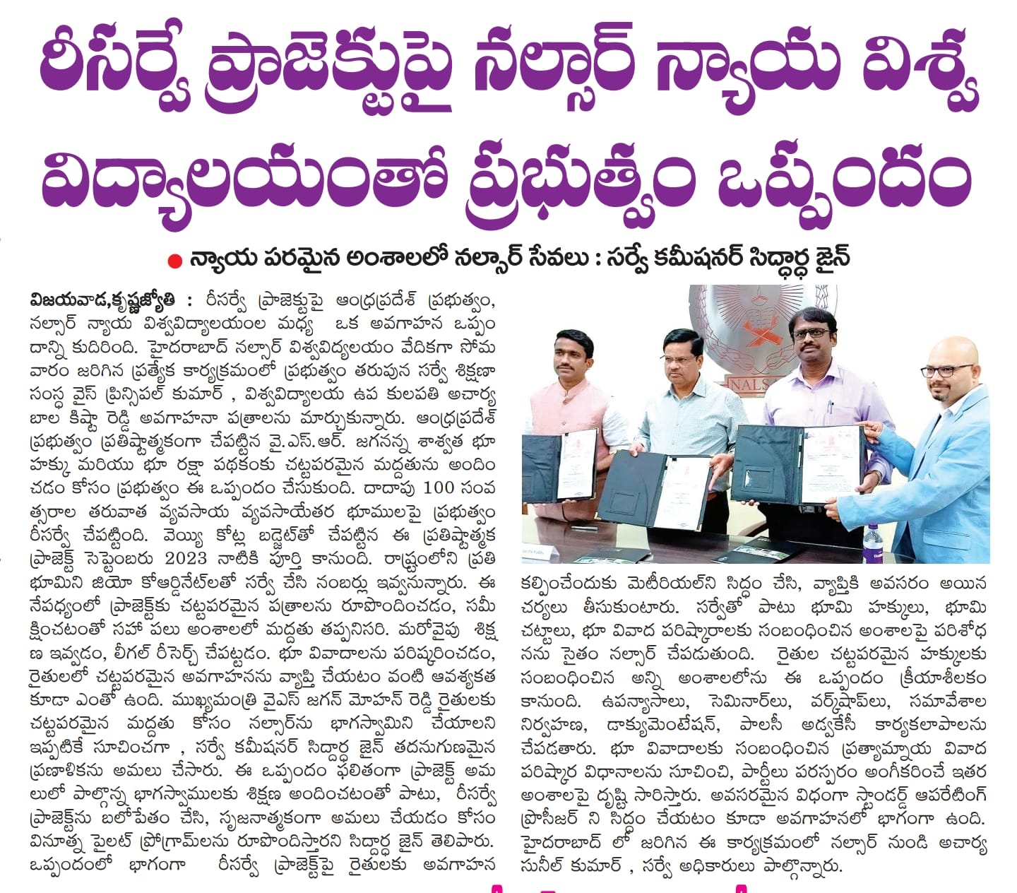 The State government and NALSAR University of Law, Hyderabad on Monday signed a Memorandum of Understanding (MoU) as part of which the latter will provide legal support for the YSR Jagananna Saswatha Bhu Hakku and Bhu Raksha Pathakam, a land resurvey project.