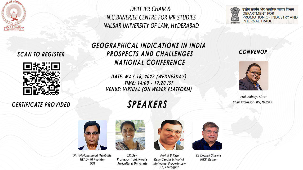 The DPIIT IPR Chair and N C Banerjee Centre of Law, NALSAR University of Law, Hyderabad with a vision to strive for excellence in teaching, research, advocacy, and increasing awareness towards IPR for all by shaping students, thought leaders, and practitioners of the domain is conducting a national conference, “Geographical Indications in India – Prospects and Challenges” on May 18, 2022. The workshop is virtual and planned on Cisco WebEx Portal.